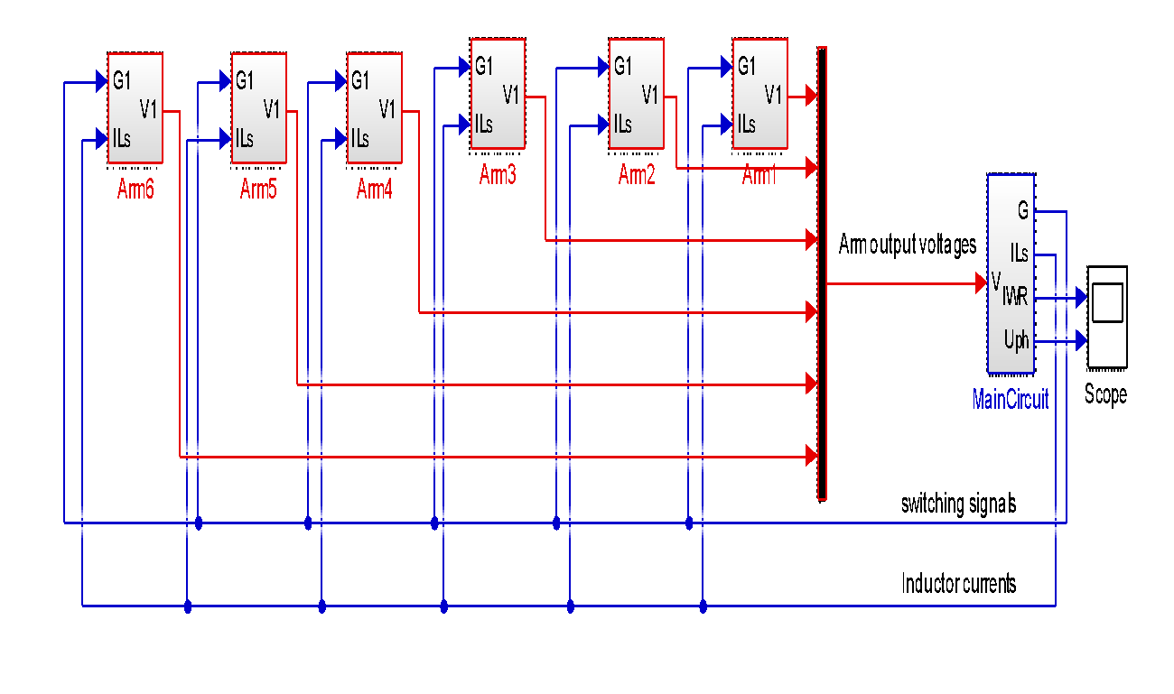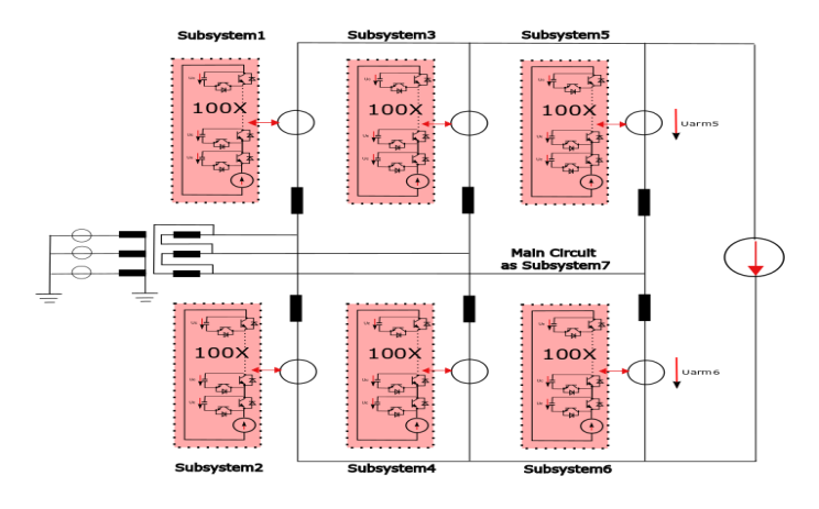 The MMC-Converter after circuit partitioning into 6 arms C-S-function blocks and one C-S-function block for the main circuit.