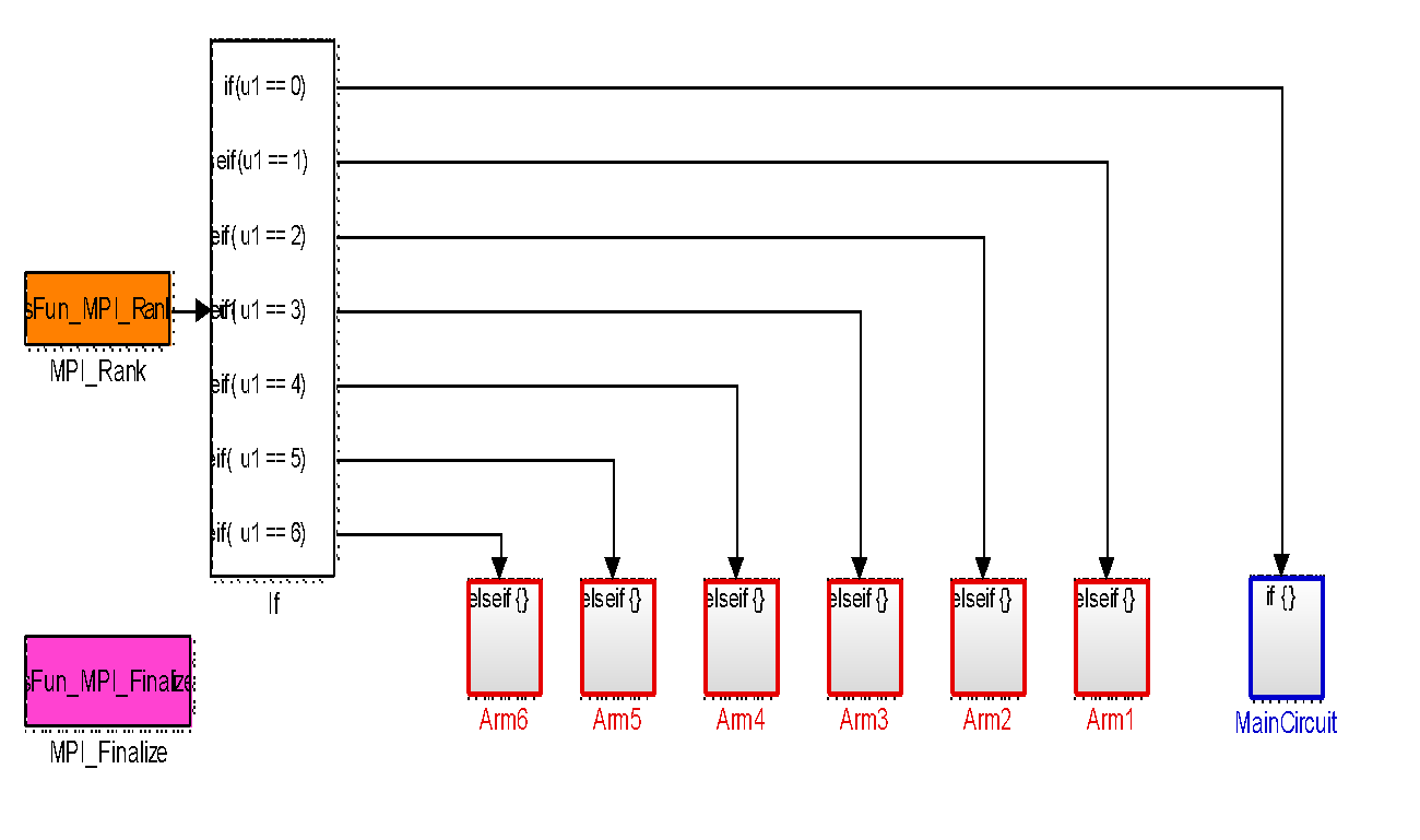 Modelling the 101-Level MMC-Converter as 7 C-S-function blocks and the Simulink MPI-Blockset.